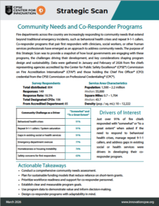 The Center for Public Safety Excellence® (CPSE®) Center for Innovation (CPSE CFI) released our third Strategic Scan on Community Needs and Co-Responder Programs, which can be downloaded here. Co-Responder programs pair first responders with other human services professionals, such as clinicians and social workers, to help address gaps in community health services, repeat 9-1-1 callers, and excessive use of hospital emergency departments.